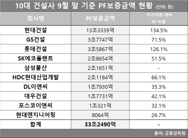 이처럼 대형 건설사들도 유동성 확보에 나서는 것은 프로젝트파이낸싱(PF) 부실 위험과 재무 리스크가 심화하고 있기 때문이다. 특히 대형 건설사들도 자기자본을 웃도는 수준의 PF 보증을 유지하며 높은 리스크 노출이 이어지고 있는 것으로 나타났다. 금융감독원 전자공시시스템에 따르면 올해 9월 말 기준 현대건설 PF 보증금액은 13조3339억 원으로 자기자본 대비 PF 비율이 134.5%에 달했다. 롯데건설도 3조5867억 원으로 126.1%를 기록했다.