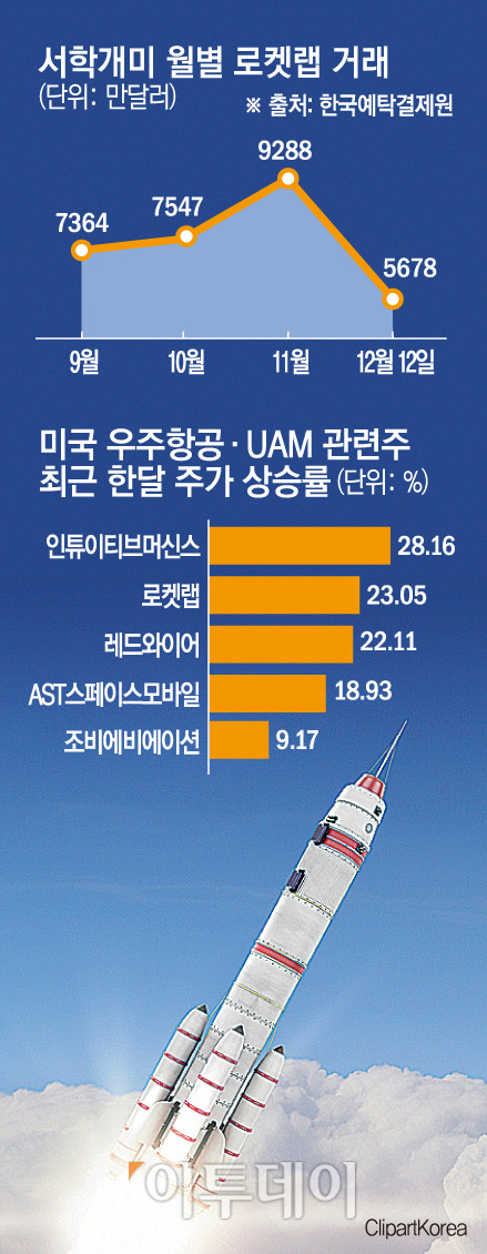 14일 한국예탁결제원에 따르면 미국 발사체 기업 로켓랩은 서학개미가 이달 들어 5678만 달러어치 사들이며 순매수 상위 16위에 올렸다. 9월(7364만 달러·30위), 10월(7547만 달러·31위), 11월(9288만 달러·23위) 등 하반기 들어 투자심리가 강화하고 있다.