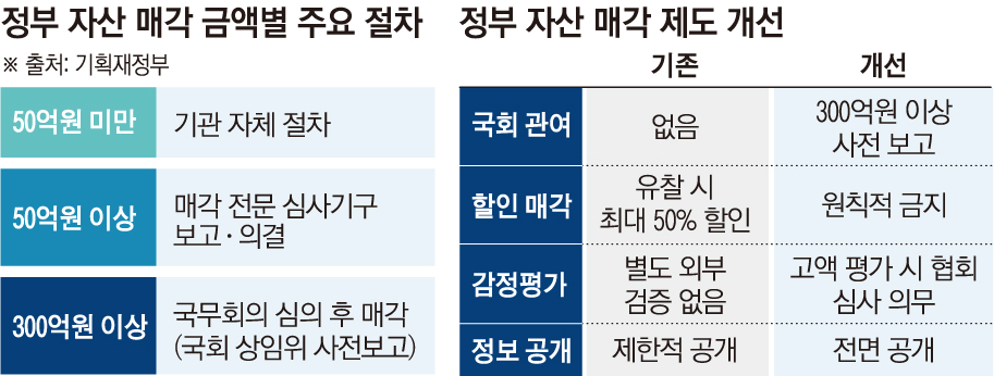 정부가 앞으로 300억 원 이상의 자산을 매각하게 되면 국회 소관 상임위에 사전 보고를 의무화하기로 했다. 감정평가액 대비 할인매각은 원칙적으로 금지한다.
