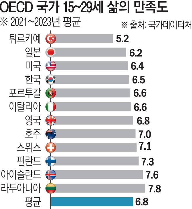 우리나라 청년의 삶의 만족도(6.5점)는 OECD 국가 중 31위다. 2021~2023년까지 OECD 평균(6.8점)보다는 0.3점 낮았다. 우리나라 청년보다 삶의 만족도가 낮은 나라는 캐나다·미국(6.4점), 일본(6.2점), 콜롬비아(6.0점), 튀르키예(5.2점)이었고 그리스, 스페인은 우리나라와 같았다.