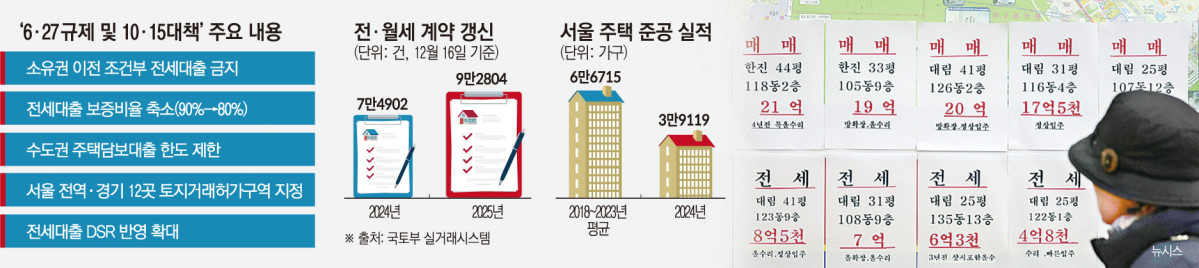 정부는 6·27 규제를 통해 수도권 주택담보대출 한도를 최대 6억 원으로 묶었고 10월에는 이를 더 줄였다. 소유권 이전 조건부 전세대출 금지와 서울 전역·수도권 12곳을 토지거래허가구역으로 지정하는 조치도 했다. 매매자금 조달 여력 축소와 전세를 끼고 집을 사는 갭투자 차단, 실거주 의무로 시장에 나와야 할 전세물건을 깔고 앉게 하는 결과로 이어졌다.