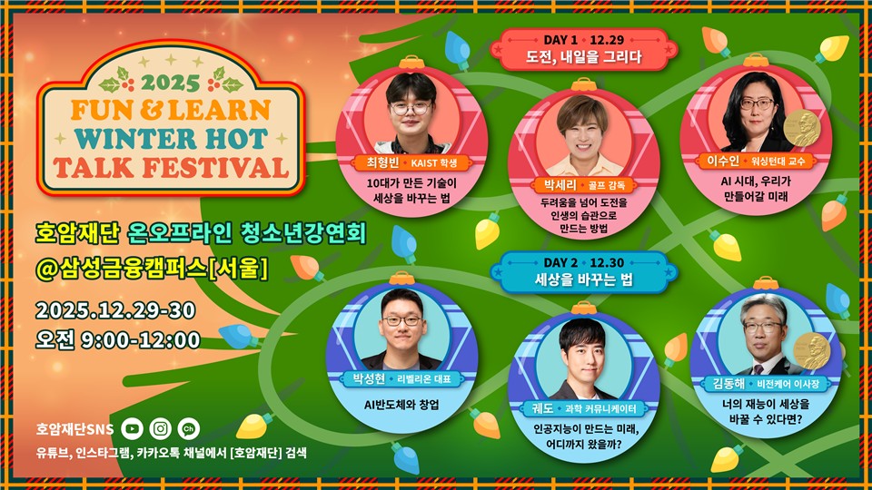 호암재단은 오는 12월 29일부터 30일까지 이틀간 서울 서초구 삼성금융캠퍼스에서 청소년 강연 프로그램 ‘펀앤런, 2025 윈터 핫 톡 페스티벌(Fun & Learn, 2025 Winter Hot Talk Festival)’을 개최한다고 밝혔다. 이번 행사는 현장과 온라인을 병행해 진행된다.