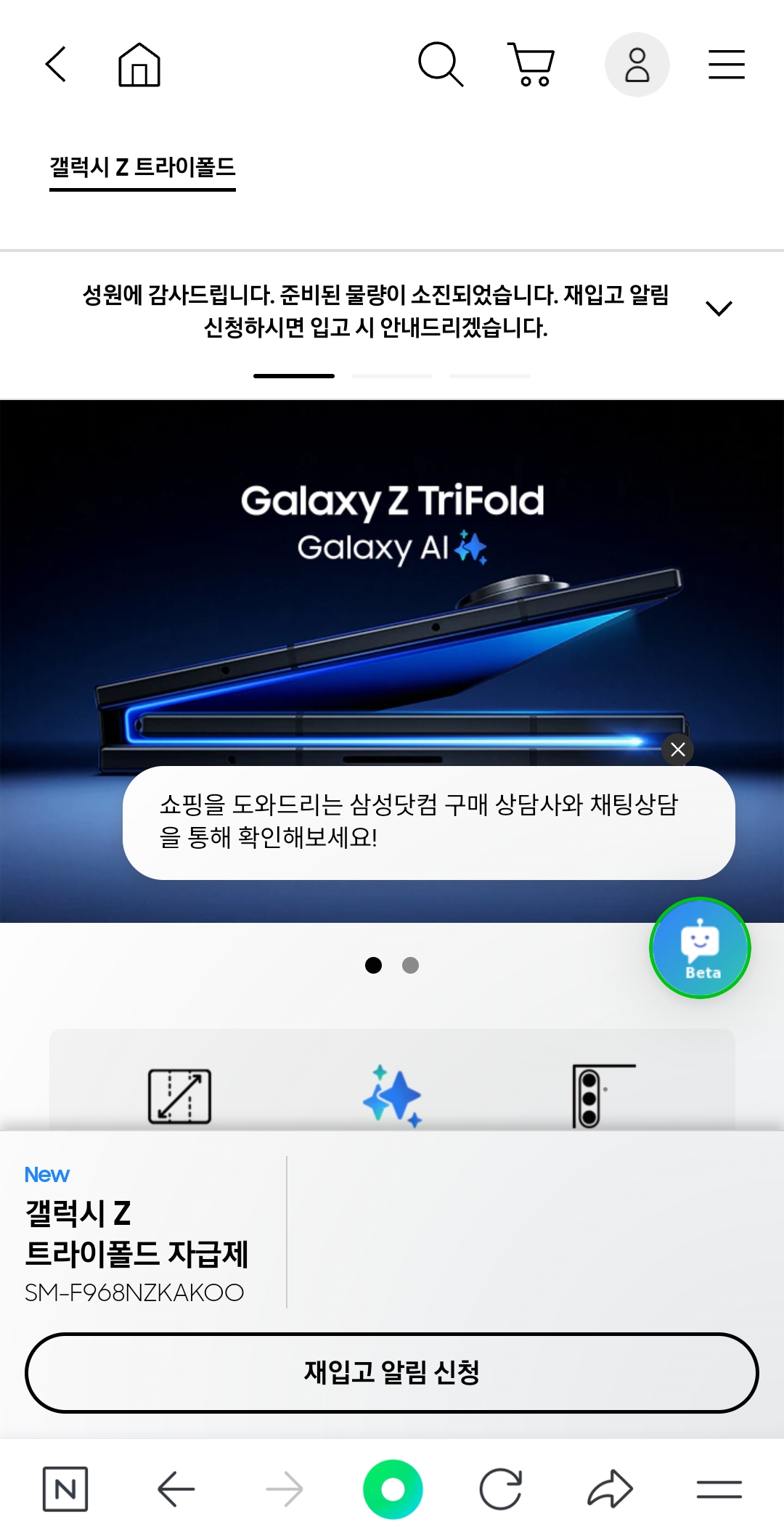 17일 삼성닷컴에 따르면 이날 오전 10시 진행된 트라이폴드 재입고 구매는 시작 2분 만에 마감됐다. 삼성닷컴에는 “성원에 감사드린다. 준비된 물량이 소진됐다”며 “재입고 알림을 신청하면 입고 시 안내하겠다”는 문구가 게시됐다. 실제 구매 페이지에도 ‘재고 알림 신청’ 버튼만 노출되며 판매 종료가 확인됐다.
