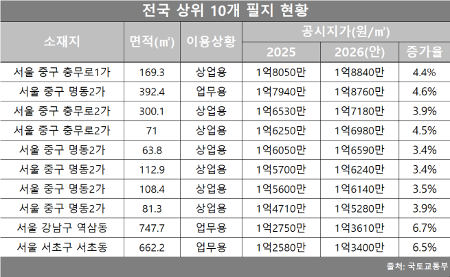 전국 공시지가 2위는 명동2가 우리은행 부지(392.4㎡)로 1㎡당 공시지가는 1억8760만 원을 기록했다. 지난해보다 약 4.5% 상승한 수준이다. 3위는 충무로2가 옛 유니클로 부지(300.1㎡)로 1㎡당 1억7180만 원으로 나타났다. 이 부지는 최근 3년간 같은 가격을 유지하다가 이번에 약 3.9% 상승했다.
