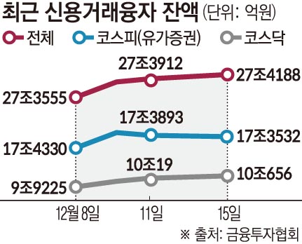 17일 금융투자협회에 따르면 국내 증시 전체 신용거래융자 잔고는 27조4188억 원(15일 기준)으로 전주(8일) 대비 633억 원 증가했다. 코스피는 17조4330억 원에서 17조3532억 원으로 798억 원 감소했다. 반면 코스닥 시장의 신용거래융자 잔고는 10조656억 원을 기록했다. 올해 들어 최고치다.