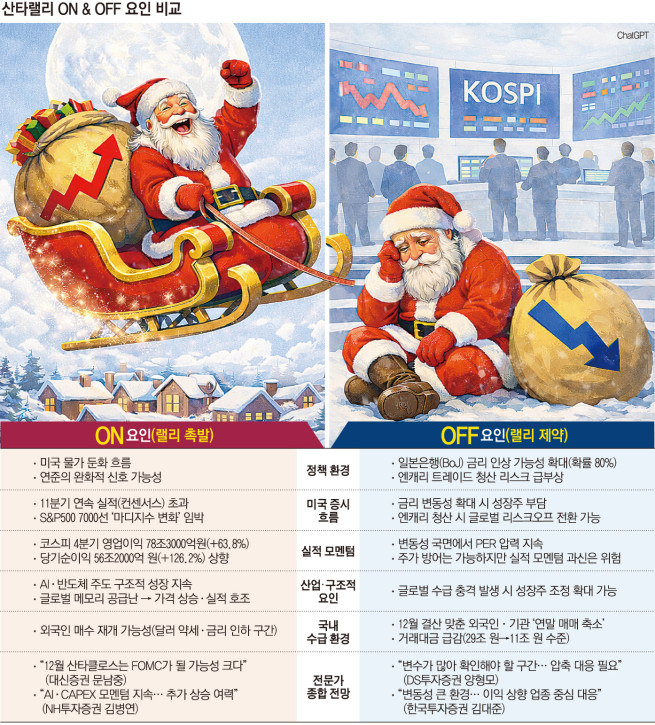 연말 증시가 산타랠리를 맞이할지를 둘러싸고 기대와 경계가 교차하고 있다. 미국 물가 둔화와 금리 인하 기대가 빠르게 살아나며 랠리 ‘온(ON)’ 신호를 키우지만, 연말 특유의 거래 위축과 엔캐리 청산 우려 같은 대외 변수는 시장을 다시 흔들 수 있는 ‘오프(OFF)’ 요인이다. 글로벌 투자은행들은 인공지능(AI)·반도체 중심의 구조적 성장세를 근거로 강세장을 전망하고 있다. 그러나 일본의 금리 정책 변화와 수급 공백이 겹치면 변동성이 확대될 수 있다는 지적도 나온다. 연말 증시는 산타랠리를 보는 양쪽 시각의 힘겨루기 속에서 ‘ON’과 ‘OFF’ 사이를 오가는 미묘한 균형점 위에 서 있다.