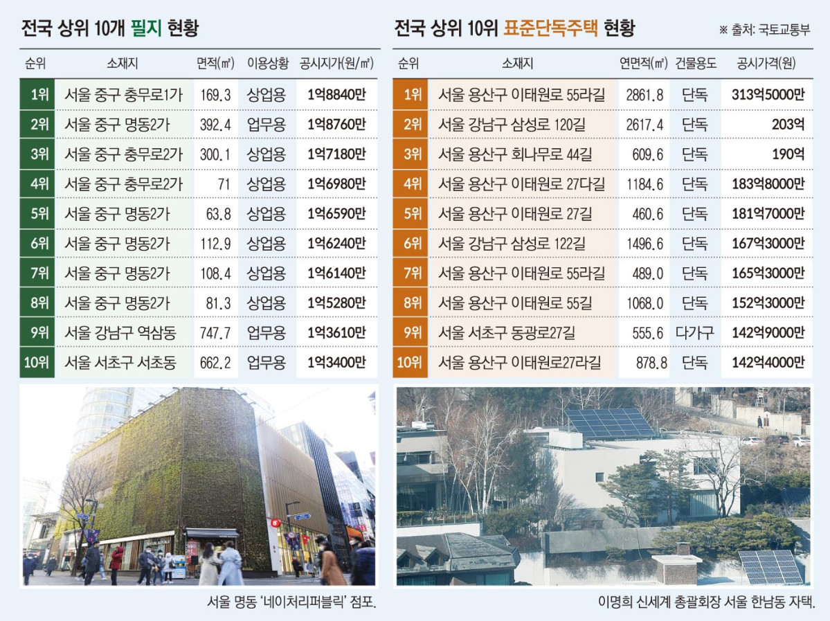 또한 표준주택 가운데서는 이명희 신세계그룹 총괄회장의 서울 용산구 한남동 자택이 11년 연속 전국에서 가장 비싼 단독주택으로 나타났다. 해당 주택의 내년 공시가격은 313억5000만 원으로 유일하게 300억 원을 넘겼다. 이 주택은 연면적 2861.8㎡로 2016년 편입된 이후 공시가격 1위를 유지하고 있다.