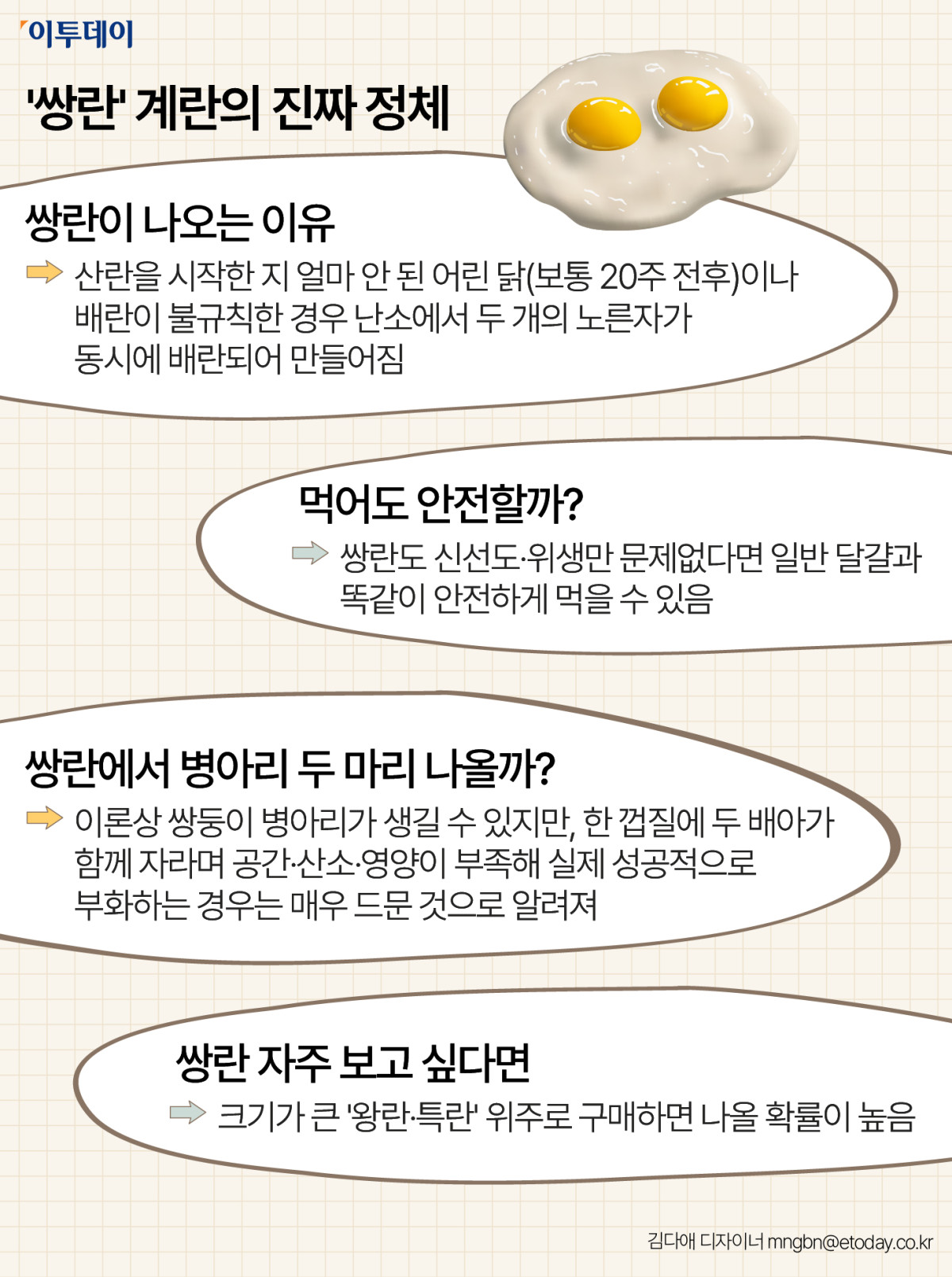 - 쌍란도 신선도·위생만 문제없다면 일반 달걀과 똑같이 안전하게 먹을 수 있음