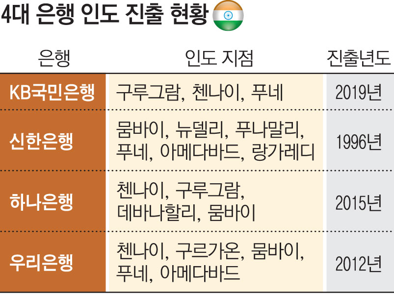 은행별로 보면 신한은행은 △뭄바이 △뉴델리 △푸나말리 △푸네 △아메다바드 △랑가레디 등 총 6개 지점을 운영하고 있다. 우리은행은 △첸나이 △구르가온 △뭄바이 △푸네 △아메다바드에 지점을 두고 있다. KB국민은행은 △구루그람 △첸나이 △푸네 지역에도 지점을 냈다.