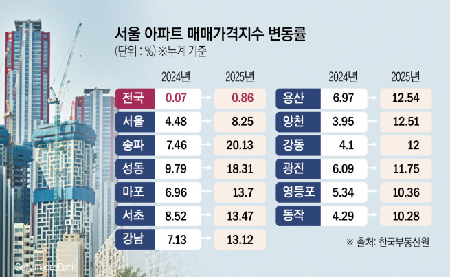 18일 한국부동산원이 발표한 12월 셋째 주(15일 기준) 주간 아파트 가격 동향에 따르면, 서울 아파트값은 올해 누적 기준 8.25% 상승했다. 전년 같은 기간(4.48%)의 2배에 가까운 수치다. 이 기간 전국 상승률(0.86%)과 비교하면, 서울과의 격차는 10배 수준이다.