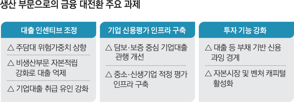 전문가들은 금융 재배선이 '구호'에 머물지 않으려면 기업대출에 과도하게 얹히는 자본부담을 완화하고 기술력·성장성 중심 심사 기준을 표준화하며 공급실적이 내부 성과지표(KPI)에 반영되도록 운영ㆍ평가 규칙의 대대적인 개선이 필요하다고 조언했다.