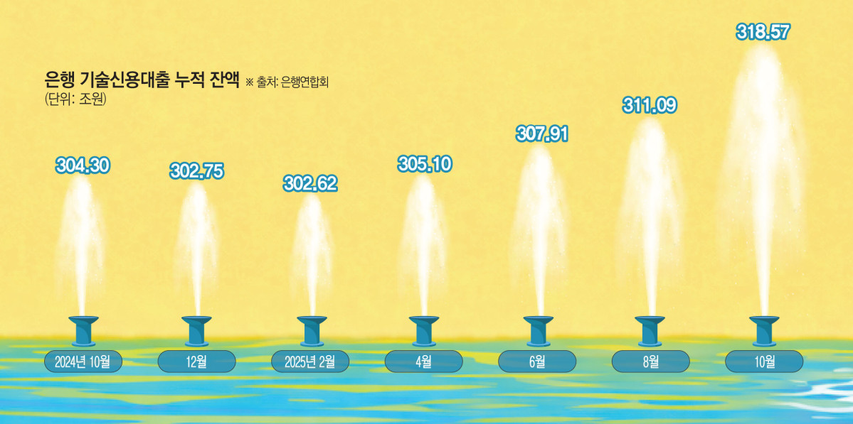 정부가 길을 트자 508조원의 생산적·포용 금융을 약속한 5대 금융그룹도 드라이브를 걸고 있다. 은행연합회에 따르면 지난해 10월 말 기준 국내 은행의 기술신용대출 잔액은 318조5677억 원을 기록했다. 이재명 정부 출범 직후인 6월 말 307조9137억 원과 비교하면 넉달새 10조6500억 원이나 불어난 것이다. 잔액 기준만 놓고 보면 2023년 4월(327조4150억 원) 이후 2년 반 만에 최고치다.