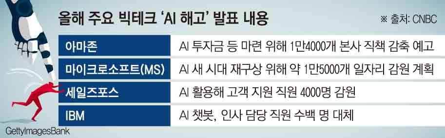 마이크로소프트(MS)는 올해 약 1만5000개의 일자리를 감축하기로 했다. 사티아 나델라 MS 최고경영자(CEO)는 직원들에게 보낸 서한에서 “MS는 새로운 시대를 위한 사명을 재구상해야 한다”며 AI 전환에 따른 변화 필요성을 강조했다. 그 밖에도 세일즈포스가 9월 AI를 활용해 고객 지원 직원 4000명을 감원했다고 발표했고 IBM은 5월 AI 챗봇이 인사 담당 직원 수백 명의 자리를 대체했다고 밝혔다.