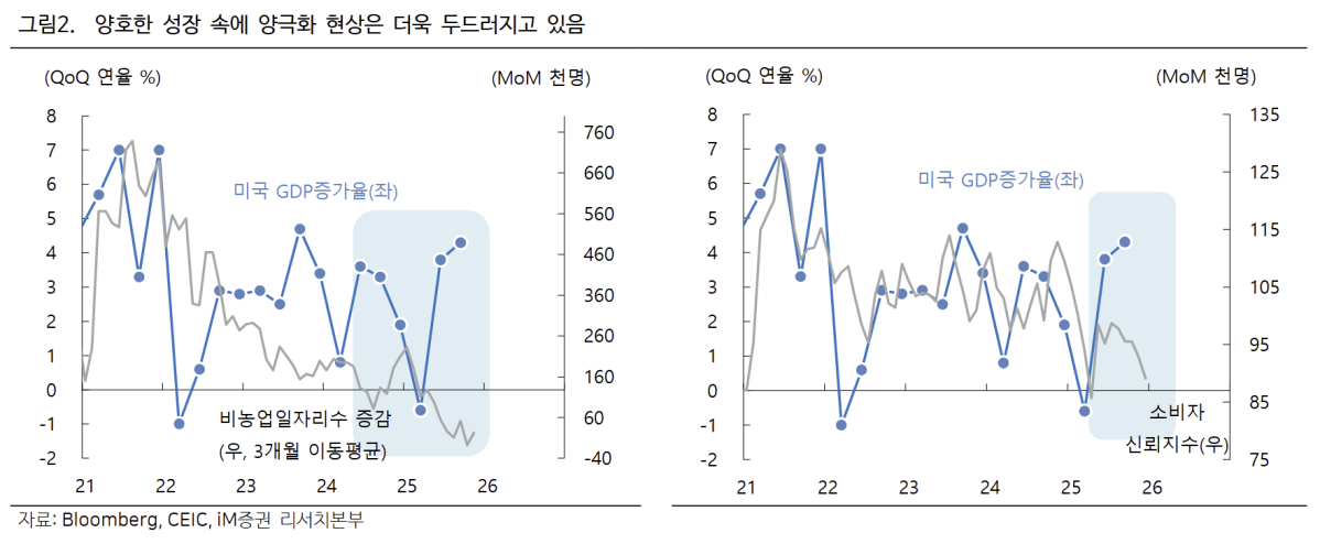 박상현 iM증권 연구원은 “양호한 성장세와 주가 상승으로 대표되는 미국 경제 예외주의가 이어지고 있지만, 소비자들은 물가와 고용 둔화로 이를 체감하지 못하고 있다”며 “이 같은 양극화는 향후 통화정책에 대한 정치적 압력을 키우는 요인이 될 수 있고, 2026년 연준의 금리인하 폭이 시장 예상보다 확대될 가능성도 염두에 둘 필요가 있다”고 말했다.