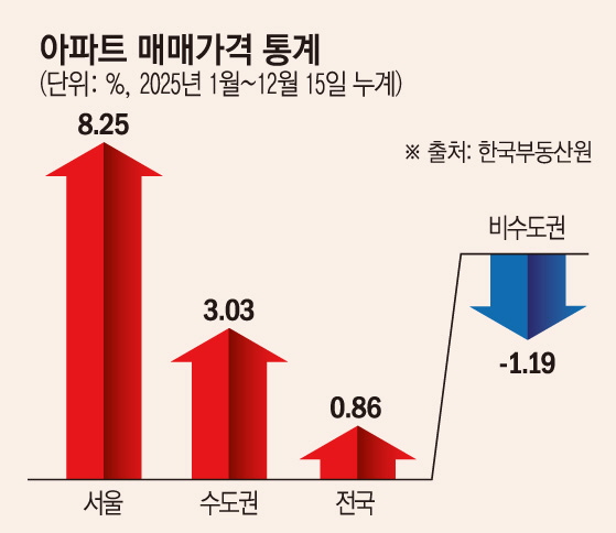 서울 집값이 뚜렷한 상승세를 보이면서 같은 기간 수도권 아파트값도 3.03% 오른 것으로 나타났다. 다만 전국 아파트 매매 가격은 0.86% 오르는 데 그쳤다. 지방만 놓고 보면 집값은 하락세였다. 같은 기간 지방 아파트값은 1.19% 떨어졌는데 지역별로 대구가 3.78% 하락하며 가장 큰 하락폭을 보였고, 대전(-2.17%)·제주(-2.13%)·광주(-1.96%) 등 순이었다.