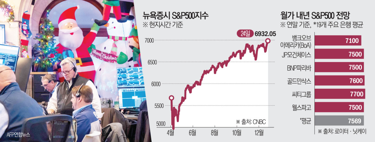 월가 주요 은행과 증권사들은 내년에도 강세장이 이어질 것으로 내다봤다. 다만 그 폭은 예년에 미치지 못할 것으로 관측됐다. 로이터통신에 따르면 19개 은행·증권사의 내년 말 S&P지수 전망치 평균은 7569다. 이는 이날 종가 대비 약 9.19% 오르는 것이다.