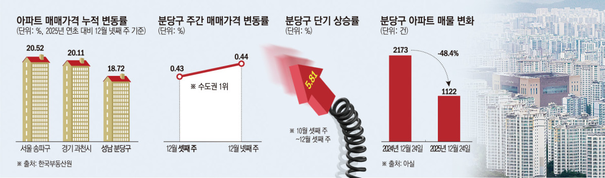 특히 최근 들어 상승 속도가 가팔랐다. 부동산원의 주간 아파트가격 동향에 따르면 성남시 분당구는 매매가격이 12월 넷째 주와 셋째 주 각각 0.44%, 0.43%를 기록해 수도권 지역 중 가장 상승폭이 컸다. 또 10월 셋째 주부터 12월 셋째 주까지 성남시 분당구 아파트 매매가격은 5.81% 오른 것으로 집계돼 전국 구 단위 지역 중 상승률 1위를 기록하기도 했다.