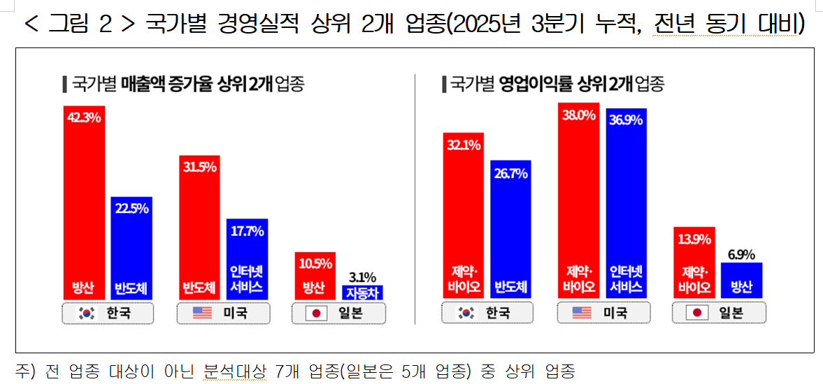 국가별 업종 성과를 보면 한국은 방산과 반도체가 성장세를 이끌었다. 방산 업종 매출액 증가율은 42.3%로 가장 높았고 반도체도 22.5%를 기록했다. 반면 철강은 마이너스 성장 정유는 사실상 정체 상태에 머물렀다. 미국은 반도체 31.5% 인터넷서비스 17.7%로 고성장을 보였으나 정유와 철강은 부진했다. 일본 역시 방산과 자동차만 제한적인 성장세를 보였고 정유와 철강은 역성장을 기록했다