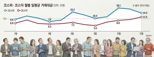 28일 한국거래소에 따르면 이달 코스닥 일평균 거래대금은 11조4800억 원(26일 기준)으로 집계됐다. 지난달 9조4790억 원보다 21.10% 급증했다. 2023년 8월(12조1220억 원) 이후 2년4개월 만에 많았다.