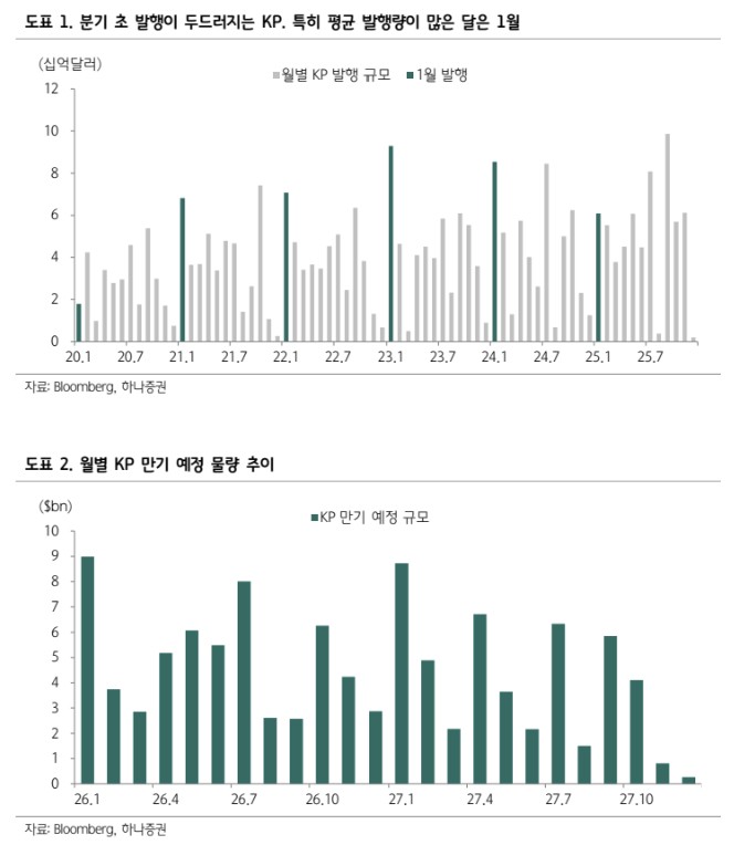 시장 구조적으로는 만기 장벽이 부담을 키운다는 판단이다. 하 연구원은 “2026년 만기 예정 KP 물량은 약 589억 달러로, 블룸버그 집계 기준 전년 대비 23% 늘어난 수준”이라며 “1월부터 공급 압력이 고점으로 올라갈 것”이라고 전했다.