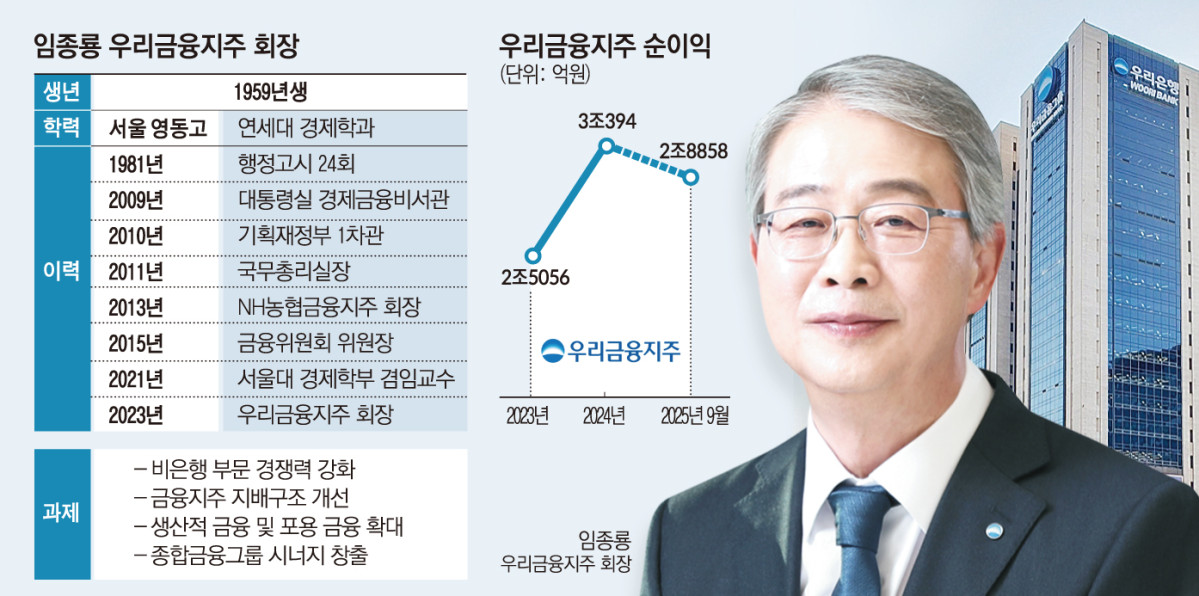 임 회장은 행정고시 24회 출신 관료로 이명박·박근혜·윤석열 정부를 거치며 금융 정책과 현장을 두루 경험한 인물이다. 2023년 3월 우리금융 회장에 취임한 이후 증권·보험 부문을 인수하며 지주 체질 개선을 주도해왔다.