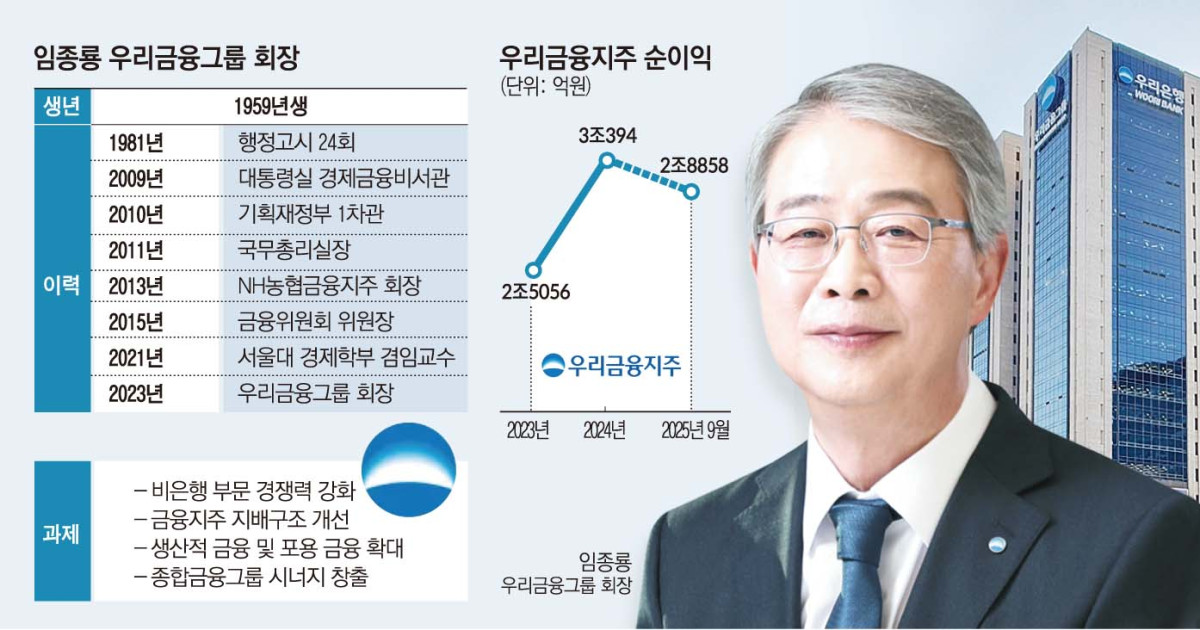 임 회장은 행정고시 24회 출신 관료로 이명박·박근혜·윤석열 정부를 거치며 금융 정책과 현장을 두루 경험한 인물이다. 2023년 3월 우리금융 회장에 취임한 이후 증권·보험 부문을 인수하며 지주 체질 개선을 주도해왔다.