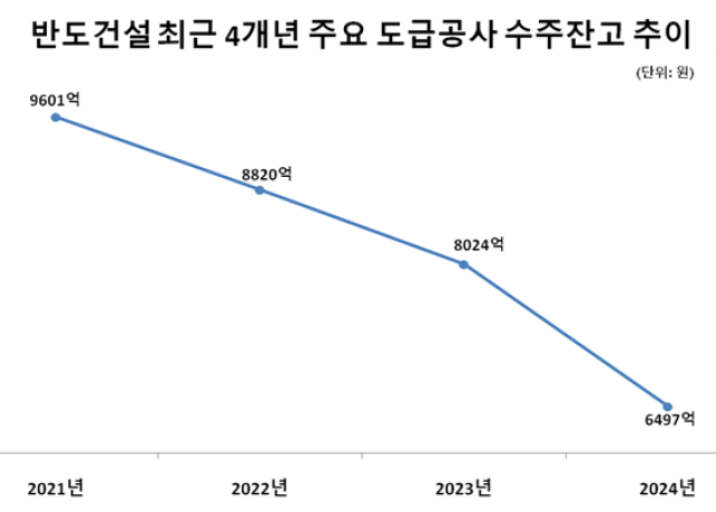 반도건설의 신규 수주 둔화는 올해만의 일이 아니다. 최근 수주가 줄어들면서 수주잔고도 하향 흐름을 이어가고 있다. 지난해 반도건설 감사보고서에 따르면 주요 도급공사 기준 수주잔고는 지난해 말 6497억 원으로 집계됐다. 수주잔고는 2021년 9601억 원에서 2022년 8820억 원, 2023년 8024억 원을 거쳐 꾸준히 감소해 왔다. 올해도 신규 수주가 사실상 없는 상황이기 때문에 감소세를 유지할 가능성이 크다.