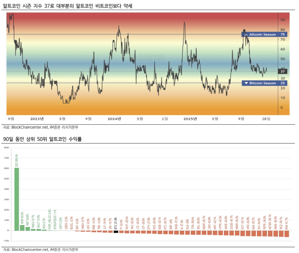 30일 iM증권은 최근 알트코인 시즌 지수가 37 수준에 머물러 있어, 올해를 알트코인 장세로 평가하기 어렵다고 이같이 진단했다. iM증권에 따르면 상위 100개 알트코인 중 75% 이상이 최근 90일 동안 비트코인보다 높은 수익률을 기록할 경우를 ‘알트코인 시즌’으로 정의한다. 현재 지수 37은 대부분 알트코인의 수익률이 비트코인 수익률을 밑돌고 있음을 의미한다.