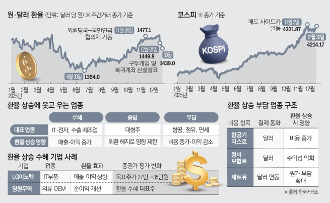 원ㆍ달러 환율의 급격한 움직임이 연말 증시의 핵심 변수로 부상했다. 고환율 부담 속에서도 당국의 개입 신호와 정책 기대가 맞물리며 시장은 불안과 안정을 오가는 국면을 이어갔다. 외국인 자금의 방향성이 환율 흐름에 민감하게 반응하며, 업종과 기업별 주가 흐름의 온도 차도 뚜렷해졌다. 증권가는 환율이 정점 국면을 지나 점진적인 안정 흐름으로 이동해야만 실적을 기반으로 한 선별적 반응이 강화될 것으로 봤다.