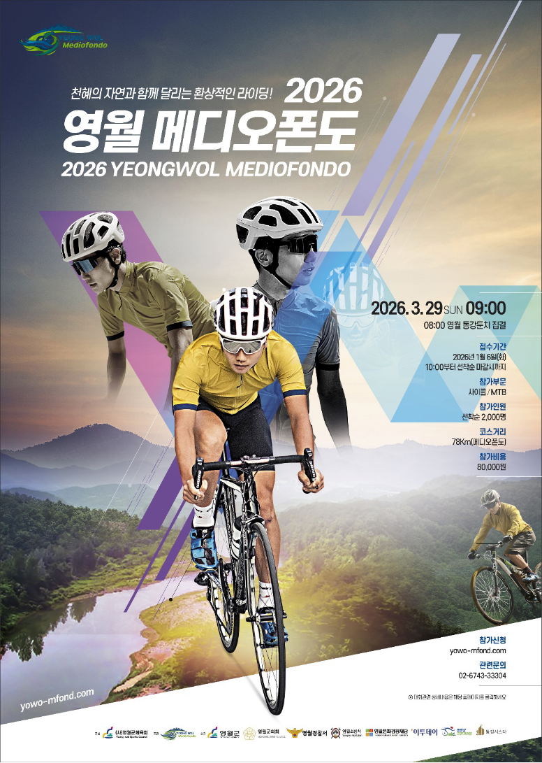 영월군은 내년 3월 29일 영월군 동강둔치에서 출발해 영월 동부 일대를 도는 ‘2026 영월 메디오폰도 자전거대회’를 개최한다고 30일 밝혔다. 이번 대회는 동강과 서강을 따라 이어지는 약 78km 코스로 구성된다. 선착순으로 신청자를 받아 전국의 사이클리스트 2000명이 참가할 예정이다.