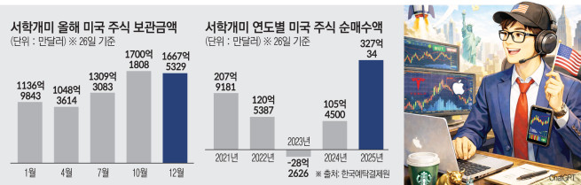 30일 한국예탁결제원에 따르면 이달 들어 26일까지 서학개미의 미국 주식 보관금액은 1668억 달러로 집계됐다. 1월(1137억 달러) 대비 46%가량 늘었다. 미국 주식 순매수 규모는 2021년 207억9181만 달러에서 5년 뒤인 올해 327억34만 달러로 약 57% 증가했다.