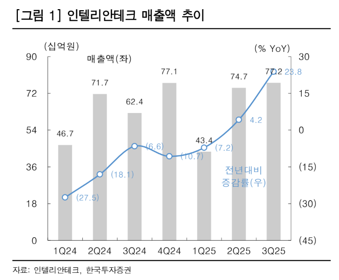 한국투자증권에 따르면 인텔리안테크의 게이트웨이 안테나 매출은 글로벌 저궤도 위성 통신망 구축 확대에 힘입어 빠르게 성장하고 있다. 2025년 3분기 지상용 안테나 매출은 지난해 같은 기간보다 25.7% 증가한 400억 원을 기록했다. AST 스페이스모바일과의 281억 원 규모 계약에 이어, 12월에는 864억 원 규모의 대형 공급 계약을 체결하며 수주 가시성도 높아진 상황이다.