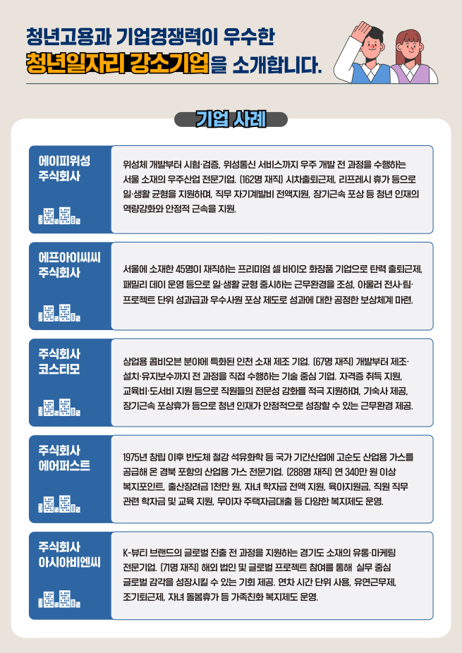 청년일자리 강소기업은 중소·중견기업에 대한 청년층의 인식을 개선하고 일자리 미스매치를 완화하기 위해 도입된 제도로 2016년부터 매년 강소기업을 선정해 오고 있다. 올해도 우선지원대상기업의 신청을 받아 청년고용 실적을 비롯해 보수·복지, 고용안정성, 이익창출능력 등을 종합적으로 평가해 청년일자리 강소기업을 선정했다.