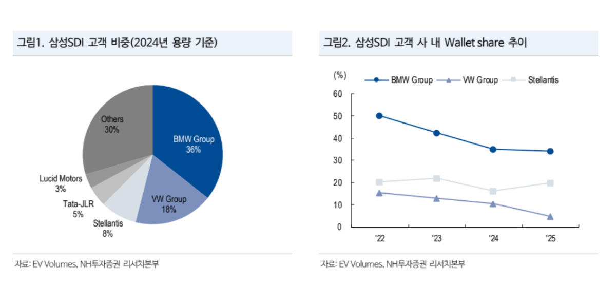 NH투자증권은 삼성SDI에 대해 전기차(EV) 부문의 부진이 올해까지 이어질 것으로 전망하며 목표주가를 기존 41만 원에서 35만 원으로 15% 하향 조정했다. 다만, 2027년 신규 프로젝트 진입과 함께 흑자 전환이 가능할 것으로 내다봤다.