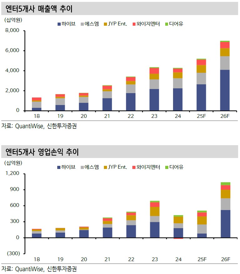 3일 금융투자업계에 따르면 지인해 신한투자증권 연구위원은 보고서를 통해 “2025~2026년 엔터 업종의 빅 사이클을 주장해 온 근거는 슈퍼 IP와 레거시 IP의 귀환, 그리고 중국 숫자 부활 때문”이라며 “엔터 5개사 합산 매출액 7조 원, 영업이익 1조 원으로 최대 실적이 예상된다”고 밝혔다.