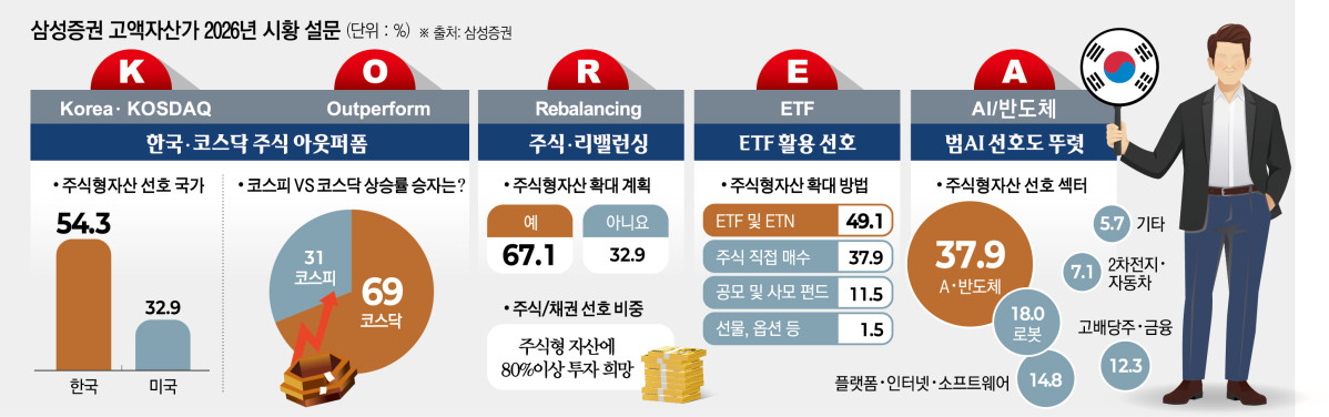 이는 △한국 주식(K-stock) 선호 △한국 및 코스닥 시장의 초과 성과(Outperform) △주식 중심 리밸런싱(Rebalancing) △ETF 활용 △AI 주도 시장을 의미한다.