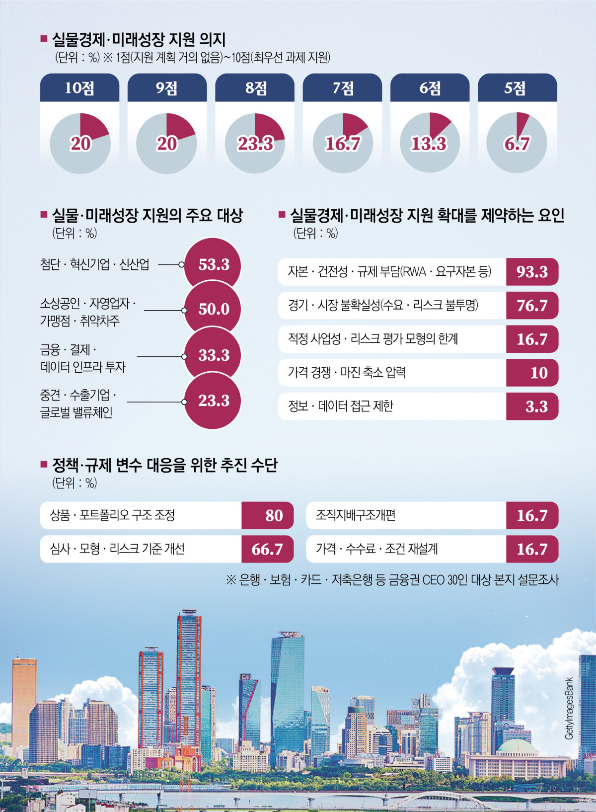 '어디에 더 지원을 늘릴 것인가'를 묻는 질문에서 CEO들의 선택은 한 방향으로만 쏠리지 않았다. 첨단·혁신기업·신산업(AI·반도체·바이오·콘텐츠 등)을 꼽은 비중이 53.3%로 가장 높았지만 소상공인·자영업자·가맹점·취약 차주도 50.0%로 뒤를 바짝 쫓았다. 성장산업 지원과 현장 금융의 버팀목 역할을 동시에 요구받는 현실이 그대로 드러난 대목이다.