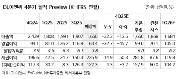 이은상 NH투자증권 연구원은 "DL이앤씨는 주택 부문을 도시정비 및 공공 발주 중심으로 수주구조를 개편하며 안정성을 제고 중"이라며 "2025년 주택 수주는 6.5조 원(+44% y-y, 별도기준)으로 추정된다"고 말했다.