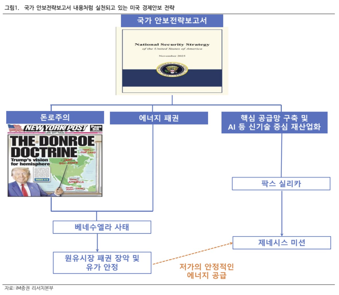 박상현 iM증권 이코노미스트는 “트럼프 행정부가 지난해 12월 발표한 국가안보전략 보고서의 경제안보 전략이 실제로 실천되고 있다”고 밝혔다. 이어 “트럼프 행정부는 ‘돈로주의’를 내세우며 서반구에서의 우위를 회복하겠다는 의지를 보고서를 통해 강하게 피력해 왔고, 이후 베네수엘라에 대한 군사행동으로 바로 이어졌다”며 “이는 돈로주의가 단순한 선언이 아니라 미국의 의지이자 계획임을 보여준 사례”라고 했다.