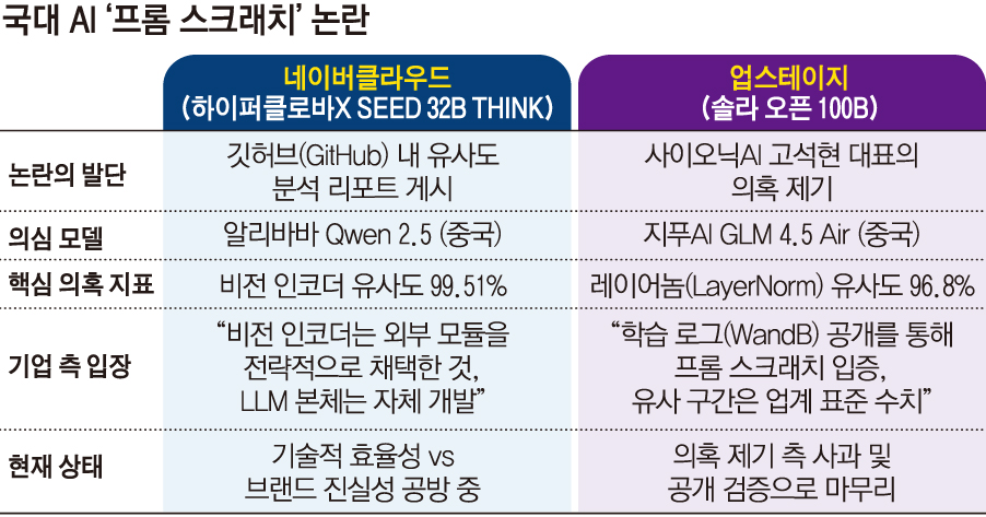 문제는 이러한 논란이 네이버에만 국한하지 않는다는 점이다. 앞서 업스테이지 역시 유사한 의혹을 받은 바 있다. 물론 업스테이지의는 공개 검증회를 통해 프롬 스크래치(From Scratch·자체 개발)를 입증하고, 의혹 제기 측의 사과를 받아냈다. 그러나 두 기업이 이러한 논란에 휘말린 데에는 본질적으로는 정부 프로젝트의 기준 자체가 모호한 데서 기인했다는 비판이 나온다. 한 업계 관계자는 “정부가 성과 위주의 ‘국산 모델’ 만들기에 급급하다 보니 오픈소스를 교묘하게 조합한 모델들을 걸러낼 정교한 검증 장치를 마련하지 못한 것”이라고 지적했다.