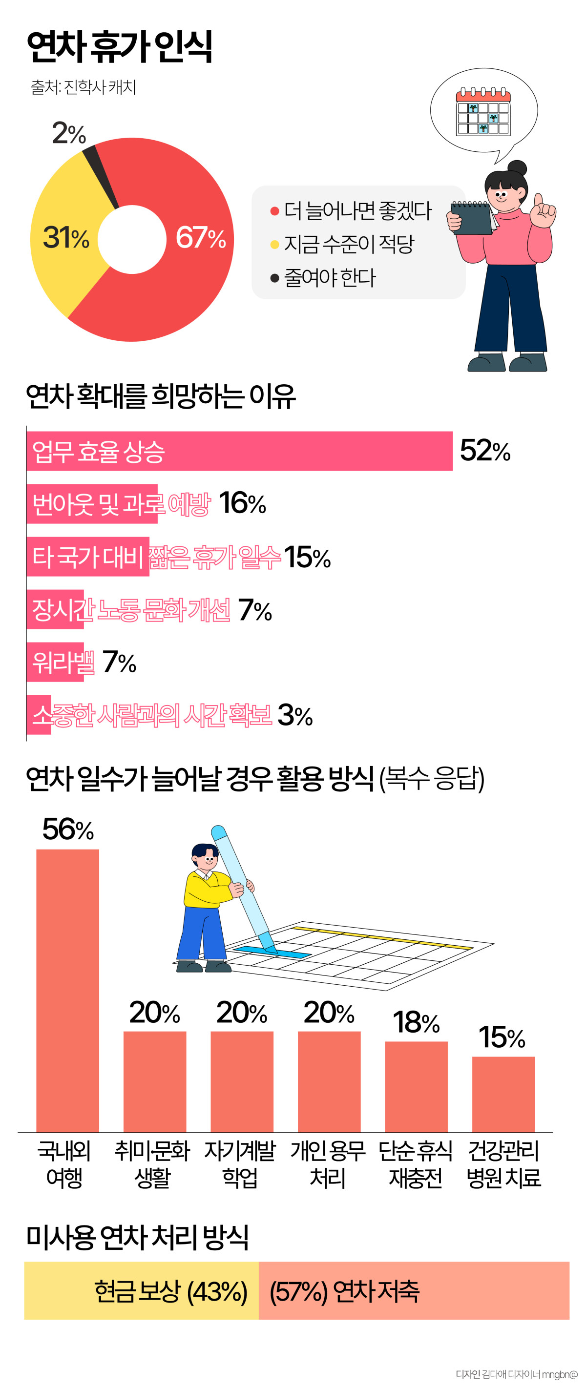 미사용 연차 처리 방식에 대해서는 '현금 보상(43%)'보다 '연차 저축(57%)'을 선호했다.