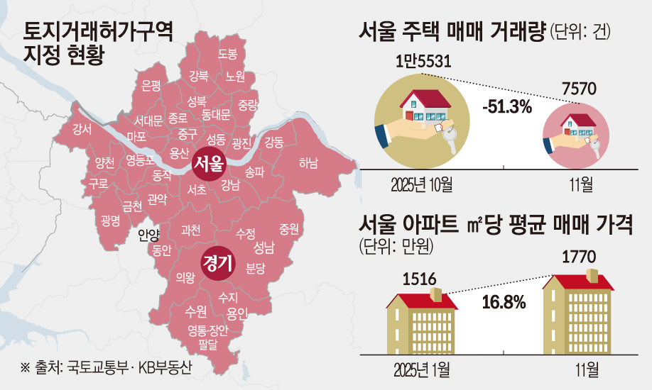 7일 국토교통부에 따르면 10·15 대책이 본격화한 직후인 지난해 11월 서울 주택 매매 거래량은 7570건으로 전월(1만5531건) 대비 51.3% 급감했다. 수도권 거래량 역시 같은 기간 2만2697건으로 전월(3만9644건)보다 30.1% 줄었다. 특히 서울 아파트 거래 신고 건수는 4395건으로 한 달 새 60.2% 감소했다. 강도 높은 규제로 불안 심리가 확산되며 매물이 잠기고 거래가 급속히 얼어붙은 것이다.