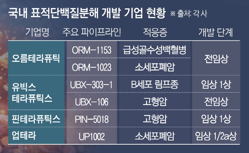 유빅스테라퓨틱스는 TPD 치료제 발굴 플랫폼 ‘Degraducer’를 기반으로 다수의 파이프라인을 개발 중이다. 이 중 UBX-303-1은 B세포 림프종 치료제로 미국·한국·폴란드에서 임상 1상을 진행하고 있으며 UBX-106은 고형암 치료제로 전임상 개발 단계에 있다. 핀테라퓨틱스는 분자접착 분해제 기반 고형암 치료제 후보물질 ‘PIN-5018’로 미국과 한국에서 임상 1상 승인을 받았고, 업테라는 PLK1 표적 TPD 후보물질 ‘UP1002’에 대해 미국에서 임상 1/2a상을 진행 중이다.