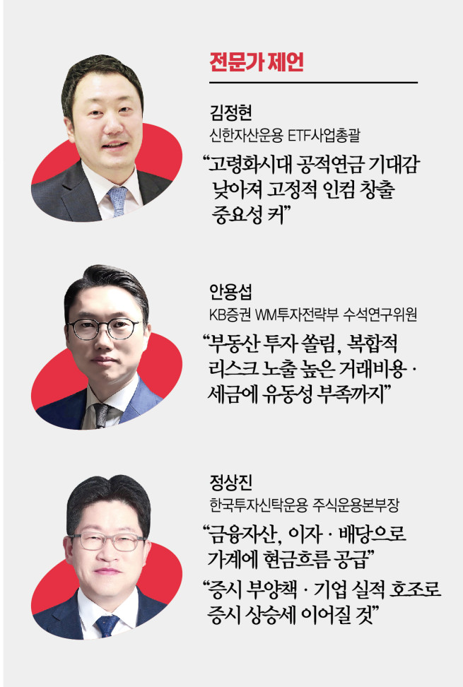 장기적 자산 성장과 안정적 노후 준비를 위해 투자자 포트폴리오에서 금융자산 비중을 확대해야 한다는 데도 의견이 모인다. 정상진 한국투자신탁운용 주식운용본부장은 “금융자산은 유동성이 풍부하고 이자, 배당 등을 통해 가계에 현금흐름을 공급하는 데 유리하다”며 “기업과 국가 경제 기여 측면에서도 주식ㆍ채권 등 금융자산과 달리 부동산은 비생산적 자산의 성격이 강하다”고 진단했다.