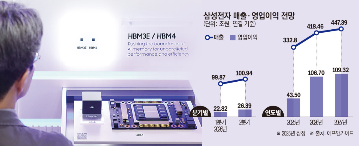 개별 증권사들의 실적 전망 곡선은 상반기부터 가파르게 오르고 있다. KB증권은 올해 1분기 삼성전자 영업이익을 지난해 동기 대비 약 4배 늘어난 25조2000억 원으로 추정했고, 2분기는 29조5000억 원까지 확대될 것으로 내다봤다. 하반기에는 분기 평균 34조 원 안팎의 영업이익이 가능하다는 전망도 제시됐다. 이 같은 흐름이 이어질 경우 연간 기준 100조 원 돌파가 높게 점쳐진다.