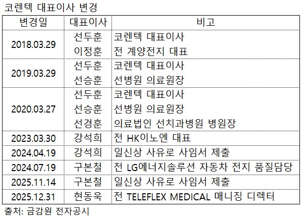 9일 금융감독원 전자공시시스템에 따르면 코렌텍은 지난달 31일 임시주주총회를 열고 현동욱 전 텔레플렉스 메디컬(Teleflex Medical) 매니징 디렉터를 신규 사내이사 및 대표이사로 선임했다. 11월 14일 구본철 전 대표가 사임서를 제출한 지 불과 한 달여 만에 이뤄진 전격적인 인사다.