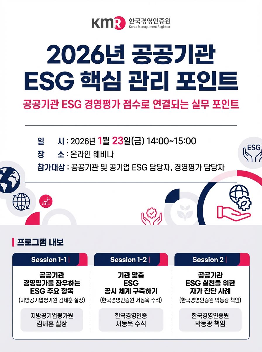 한국경영인증원은 오는 2026년 1월 23일 공공기관 ESG 담당자를 대상으로 ‘2026년 공공기관 ESG 핵심 관리 포인트’ 온라인 세미나를 개최한다. 이번 세미나는 공공기관 경영평가에서 실제 점수에 영향을 미치는 ESG 항목을 중심으로, 환경·사회·거버넌스 영역별 핵심 관리 요소와 실무 대응 방향을 정리하는 데 목적을 두고 마련됐다.