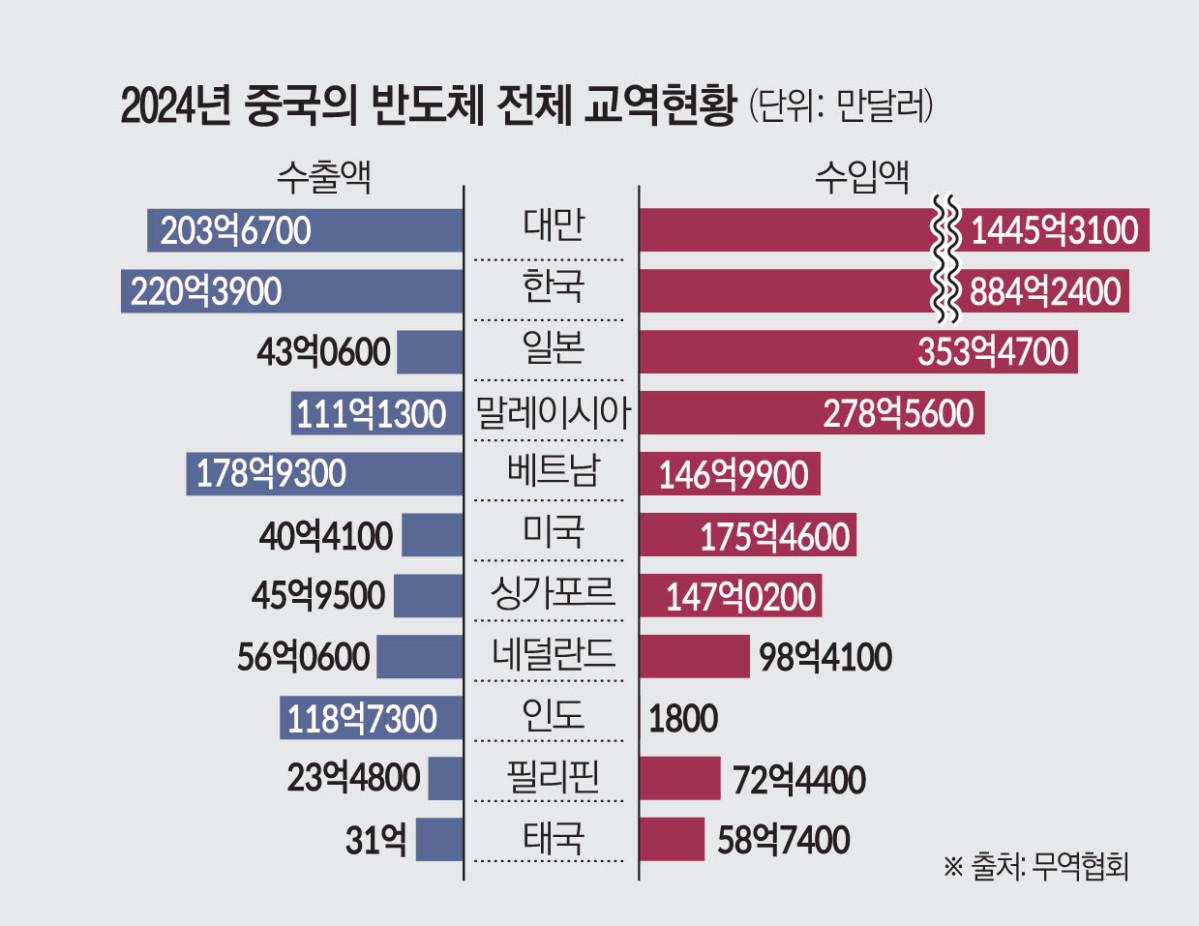 교역 지표도 이를 뒷받침한다. 한국무역협회에 따르면 2024년 기준 중국의 메모리 반도체 교역액은 한국이 636억4600만 달러로 1위를 기록했다. 시스템 반도체 교역에서도 한국은 407억8500만 달러로 대만에 이어 2위를 차지했다. 중국이 반도체 분야에서 ‘탈미국’을 준비해왔지만, 공정 전반에서 아직 완전한 자립 단계에 이르지 못한 만큼 한국 기업에 대한 의존도가 여전히 높다는 분석이다.