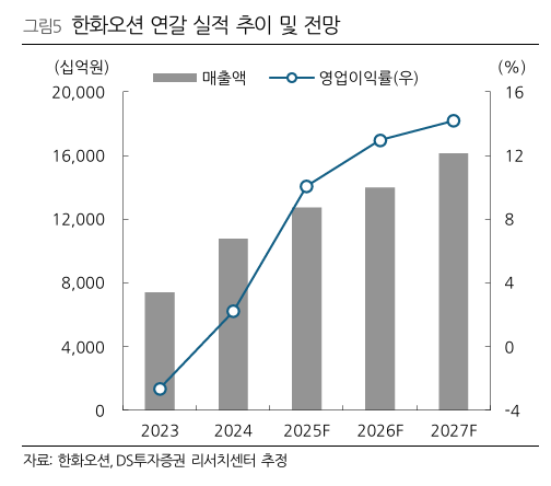 DS투자증권은 한화오션의 4분기 실적이 일부 일회성 요인과 해양플랜트 부문 적자 영향으로 시장 기대치를 소폭 하회할 것으로 내다봤다. 4분기 매출액은 3.3조 원으로 전년 대비 소폭 증가하고, 영업이익은 3630억 원으로 두 자릿수 이익률을 기록할 전망이다. 다만 임직원 관련 일회성 비용이 확대됐고 해양플랜트 부문의 적자가 이어지며 컨센서스 대비 영업이익이 약 9% 낮을 것으로 예상했다.