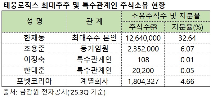 태웅로직스는 콜옵션 행사 만기일(2025년 5월 9일)을 한 달여 앞둔 지난해 4월 7일, 약 126만 주(60억 원 규모)에 대한 콜옵션을 행사하며 행사자로 최대주주 한재동 회장의 장남 한대훈 씨를 지정했다. 한 씨는 5월 9일 해당 주식을 전량 취득했는데, 취득 자금 60억 원은 부친인 한 회장으로부터 빌렸다. 한 회장은 아들의 자금 마련을 위해 본인 소유의 태웅로직스 주식을 담보로 대출을 받았다.